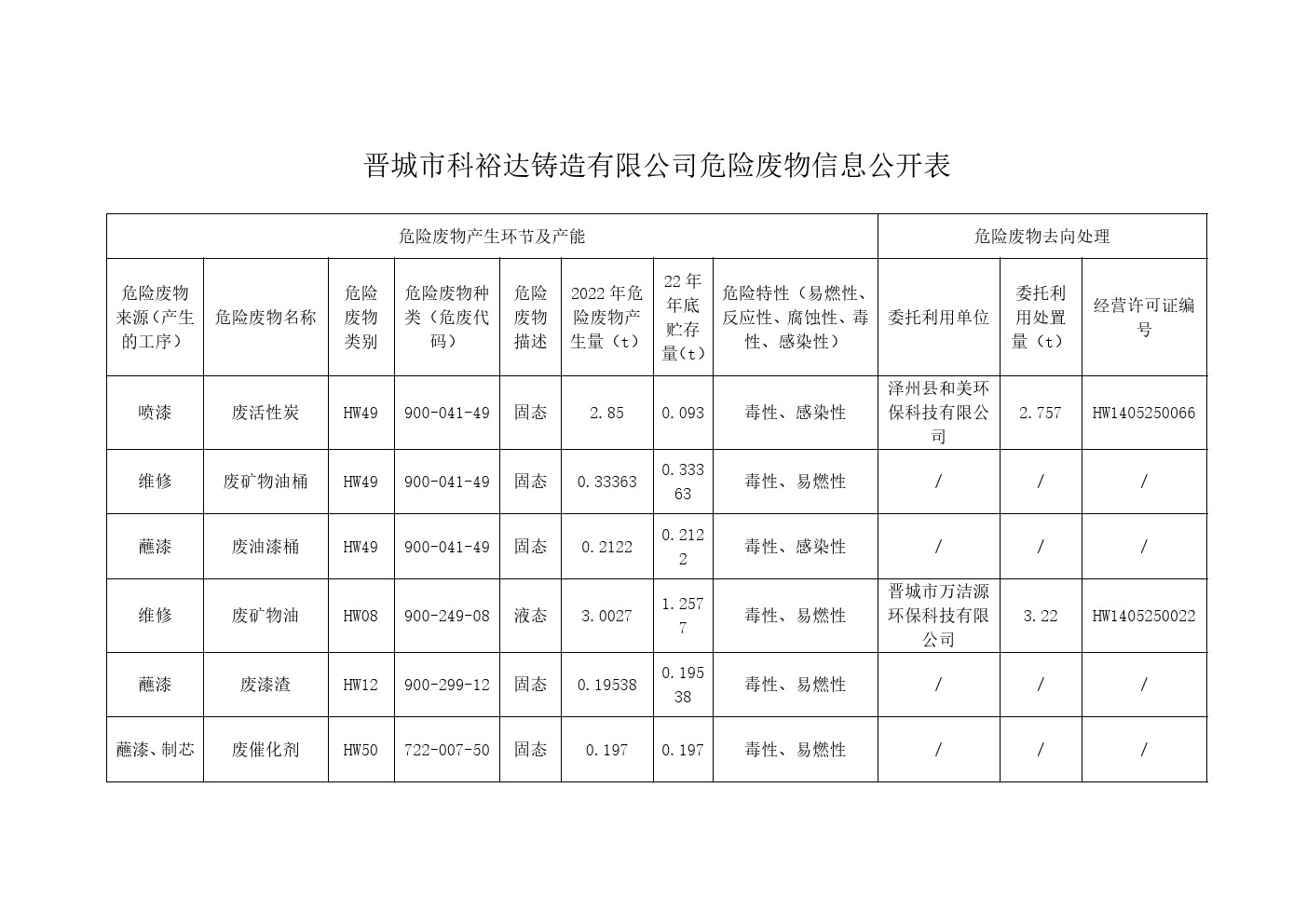 晉城市科裕達(dá)鑄造有限公司危險(xiǎn)廢物信息公開表